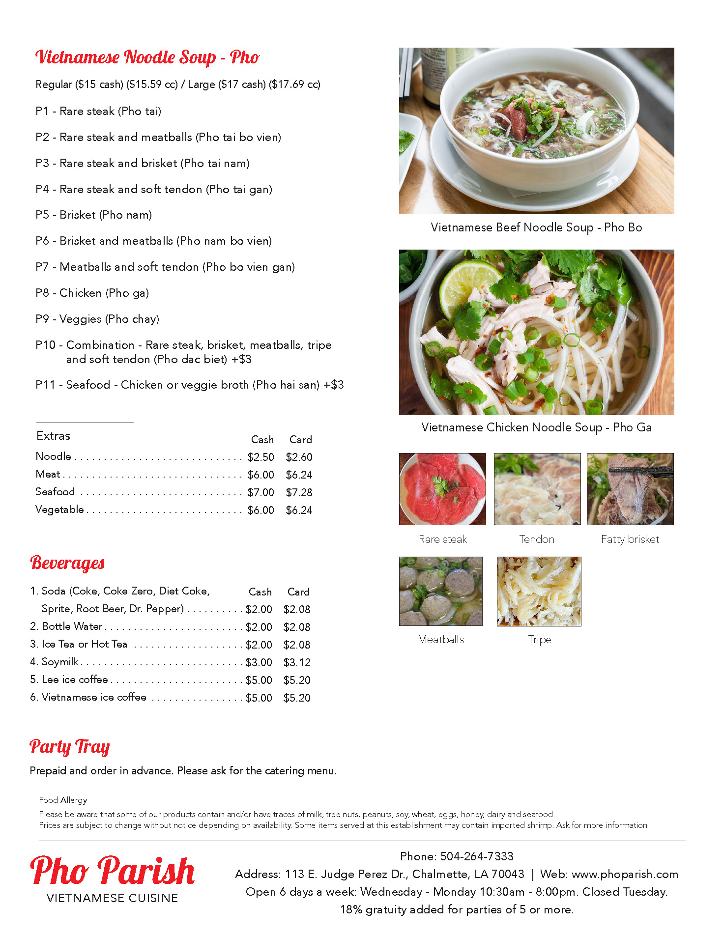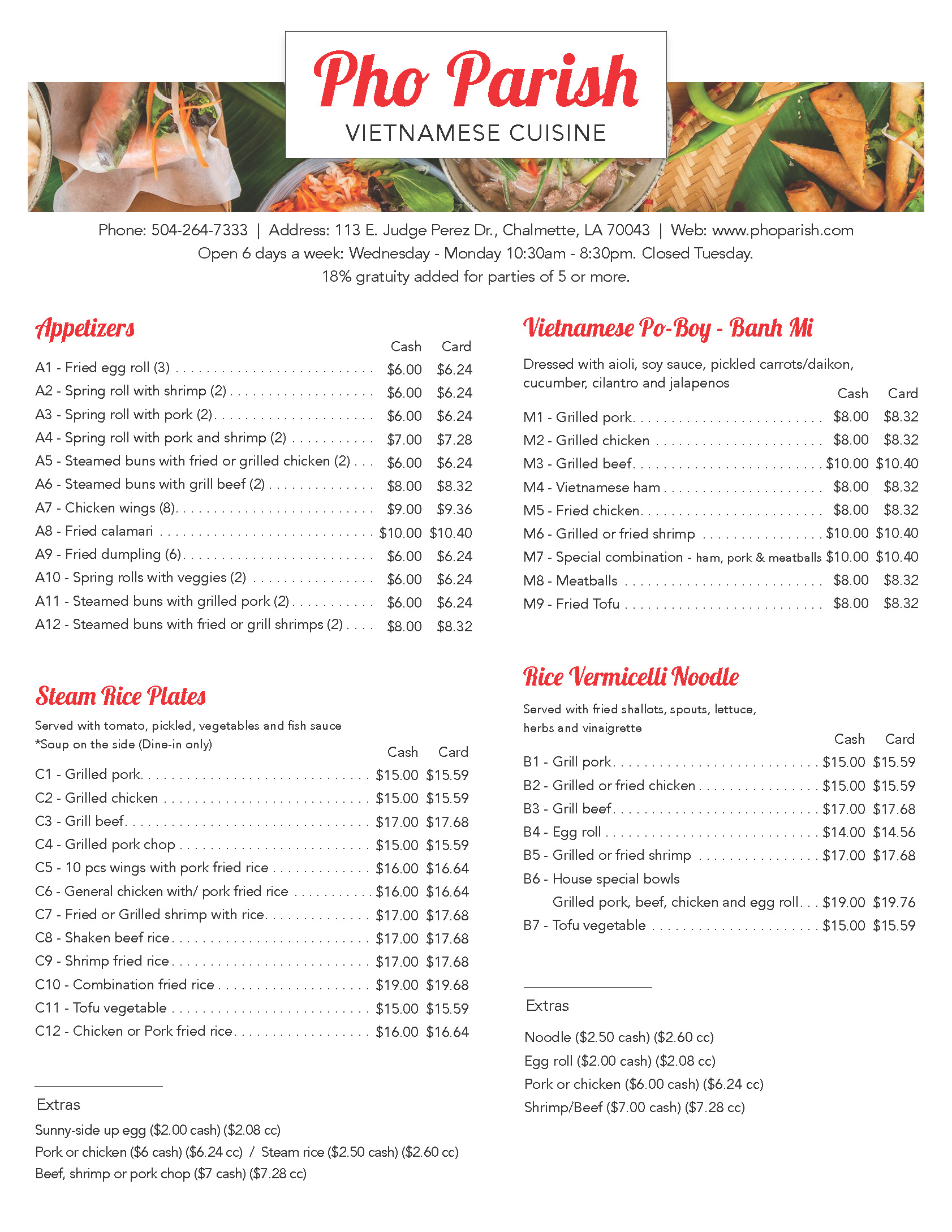 Pho Parish is a family owned and operated restaurant in the city of Chalmette, LA. At Phở Parish, our passion is simple: to make a healthy Vietnamese phở noodle soup offering robust flavors and aromas. We’ve revolutionized the way phở is made; using top-grade meats to create a healthier soup broth that’s lower in calories and cholesterol. Our signature broth is paired with fresh locally sourced produce, high quality ingredients and spices to produce the perfect bowl of phở. We also specialize in cooking different Vietnamese cuisines to satisfied all your taste palette. Come give us a try and thank you for supporting our local business.